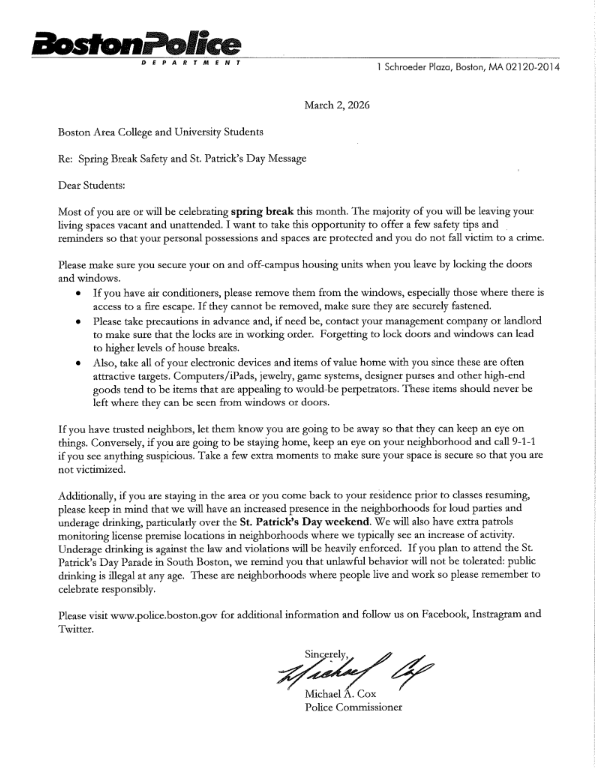 Commissioner Cox issues letter to area College and University students prior to 2026 Spring Break & St. Patrick’s Day Weekend