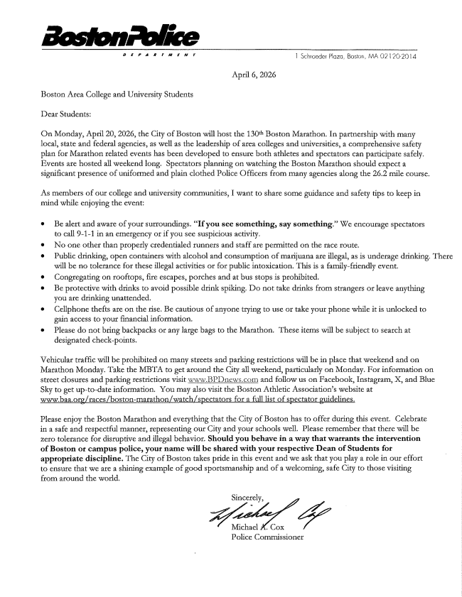 Commissioner Cox Issues Letter to Area College Students Prior to 2026 Boston Marathon. https://police.boston.gov/2026/04/07/commissioner-cox-issues-letter-to-area-college-students-prior-to-2026-boston-marathon/
